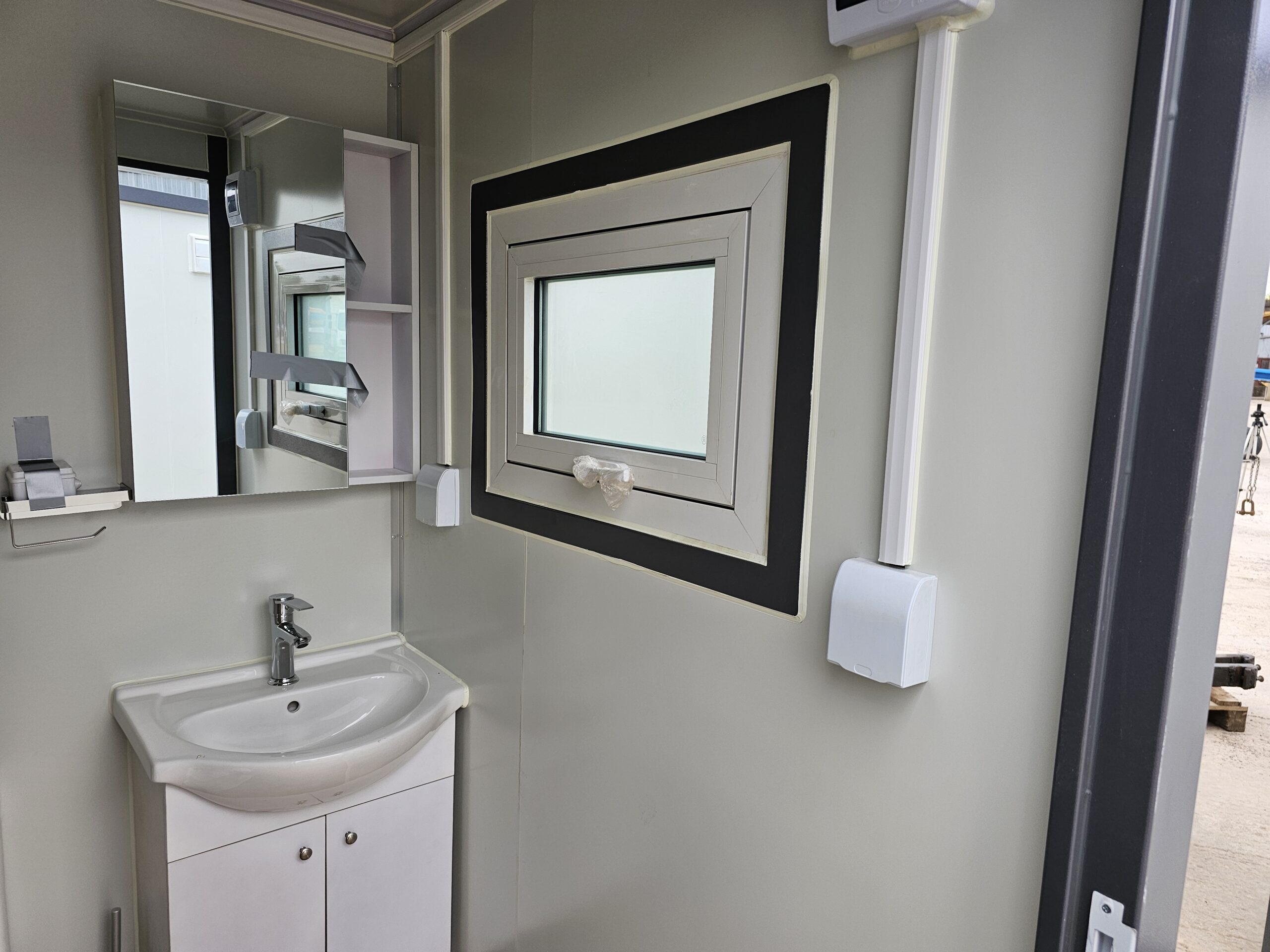 Unidad sanitaria portátil con ducha y cortina, que incluye inodoro, lavabo y espejo. Compacta, resistente y fácil de instalar en cualquier entorno.