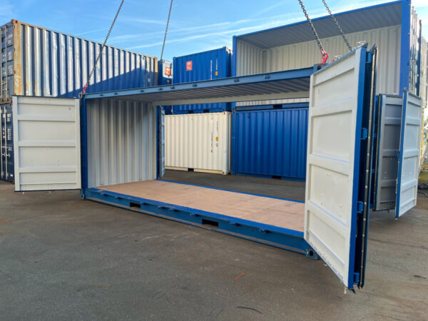 Contenedor 20′ con doble apertura lateral, RAL 5010, certificado CSC, calidad IICL6 tras un solo viaje. Acceso práctico desde ambos lados. Ideal para carga pesada y voluminosa.
