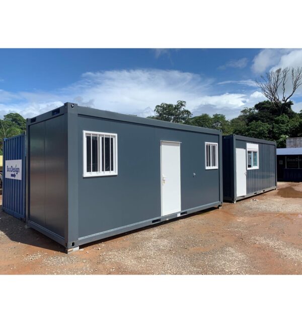 Módulo prefabricado negro versátil y elegante, ideal para oficinas, aulas, eventos o espacios temporales. Rápida instalación, personalización total y alta eficiencia térmica.