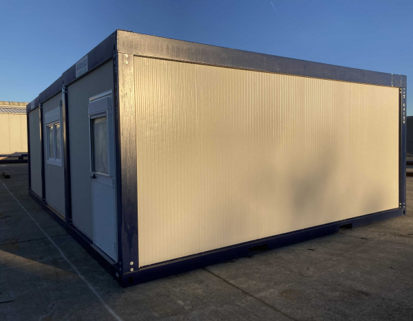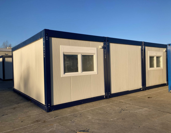 Contenedor sanitario doble de 3x2 m con 2 aseos, urinarios, fregaderos, iluminación LED, claraboyas y suelo de PVC. Completamente equipado y listo para usar.
