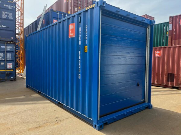 Contenedor 20'HC con puertas seccionales Hörmann, calidad IICL6 tras un solo viaje. Perfecto como garaje, almacén o taller móvil. No apto para transporte marítimo.